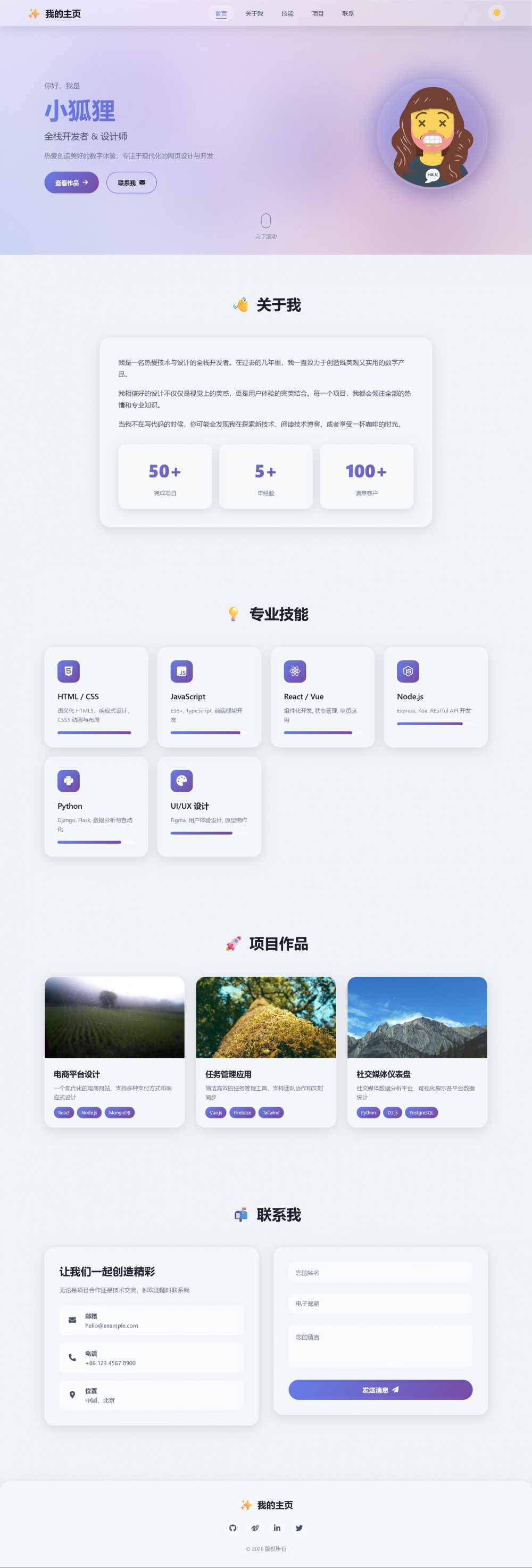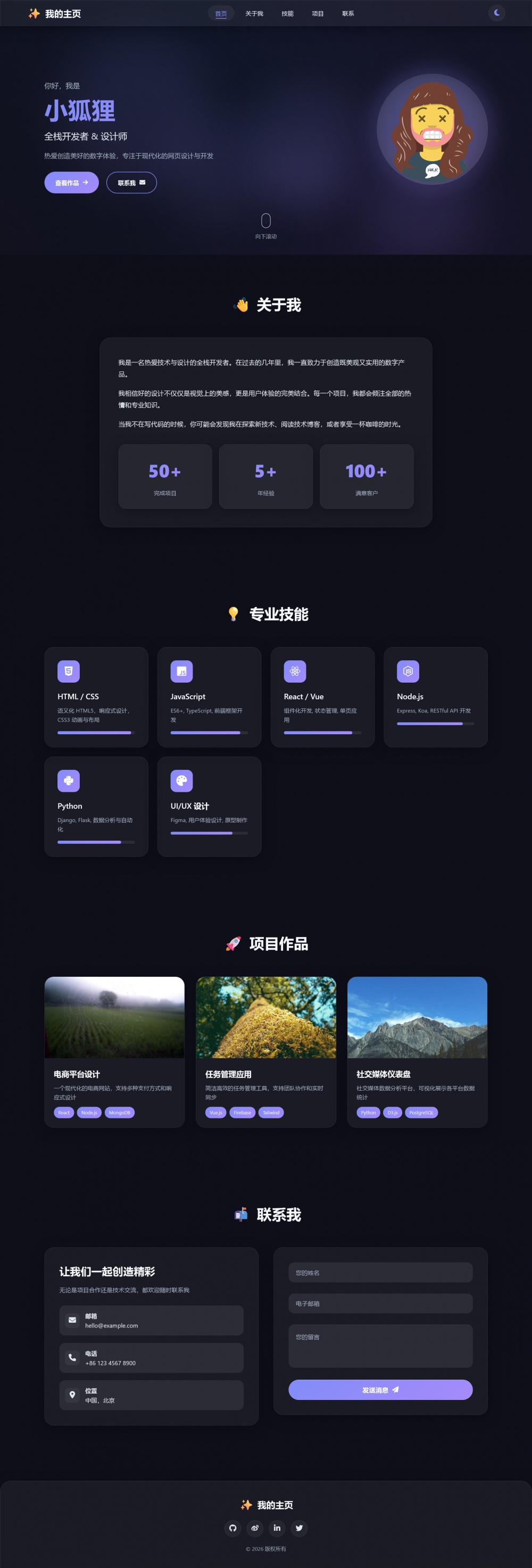 内容滚动渐入、数字动态增长、技能进度条自动填充,卡片/按钮悬停上浮,导航随滚动高亮,滚动与动画流畅不卡顿。