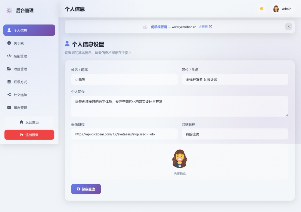 带账号密码登录权限,可修改个人信息、简介、技能、作品、联系方式、社交链接,管理留言板,支持数据备份/导入/恢复,修改后前台实时生效。